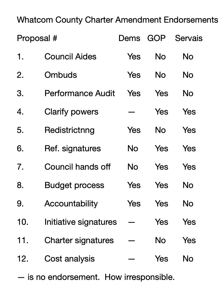 Oh yes, the GOP and Dems have listed their endorsements - but with zero explanation for their choices. I could link to both of their websites, but it is just as easy for me to show you here. So, here is a quick chart of what the Whatcom Democratic Party and the Whatcom Republican Party each recommend, along with what I recommended in my recent article. They give you no more information on each amendment than I show you here. They expect us to blindly vote as they dictate. Absurd.