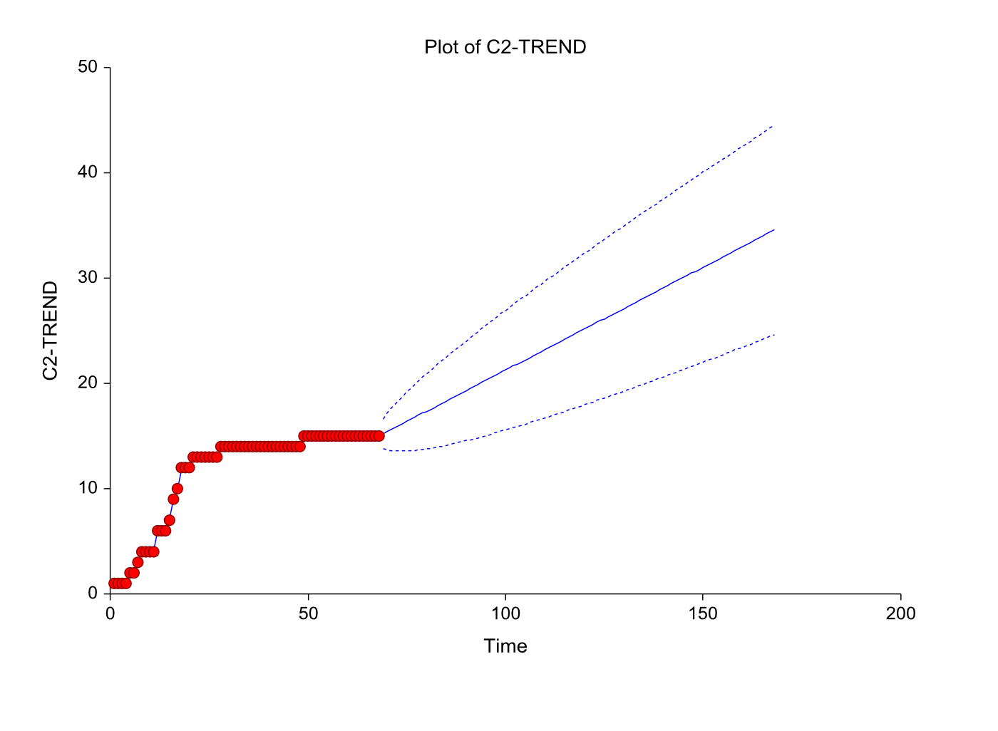 Our transparent projection model plays one key role: It signals a statistically defensible early-warning alert—and, by extension, window of opportunity for response. The model incorporates the “ARIMA” method (Auto Regressive Integrated Moving Average), a standard forecasting tool that is well-suited to San Juan County’s present quiescent stage. Our model (shown below) was deemed adequate by the NCSS Statistical system, the software we used to implement it.