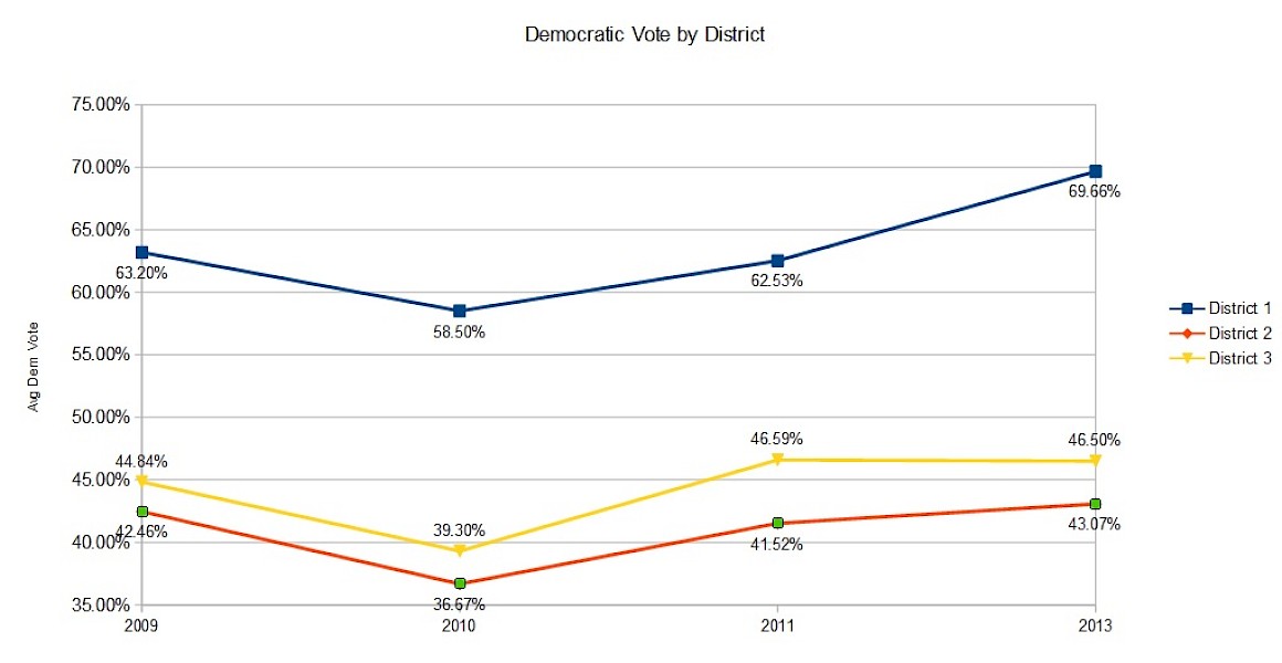 Here is the breakdown by district of the Democratic votes for the last four years. As you can see, the Democratic total of votes continues to grow in all three districts. This is especially telling since the last redistricting (2012) added more conservative precincts to the 2nd District, and moved more liberal precincts into the 1st. Even with that boost, the Republicans are losing ground county-wide.