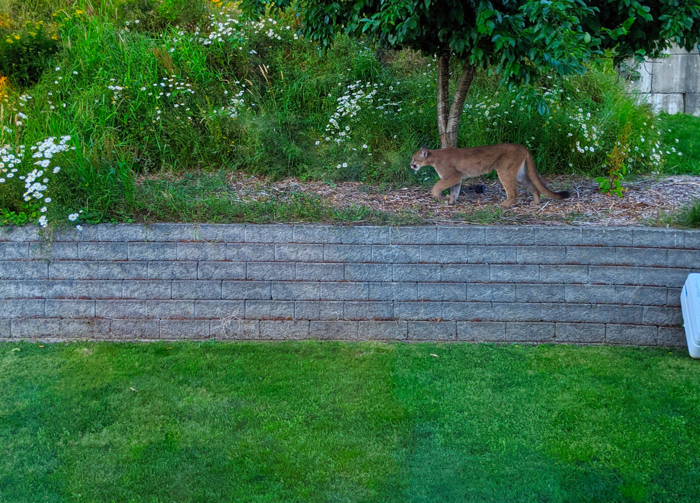 A cougar strolling along a backyard wall inside the Bellingham city limits. .