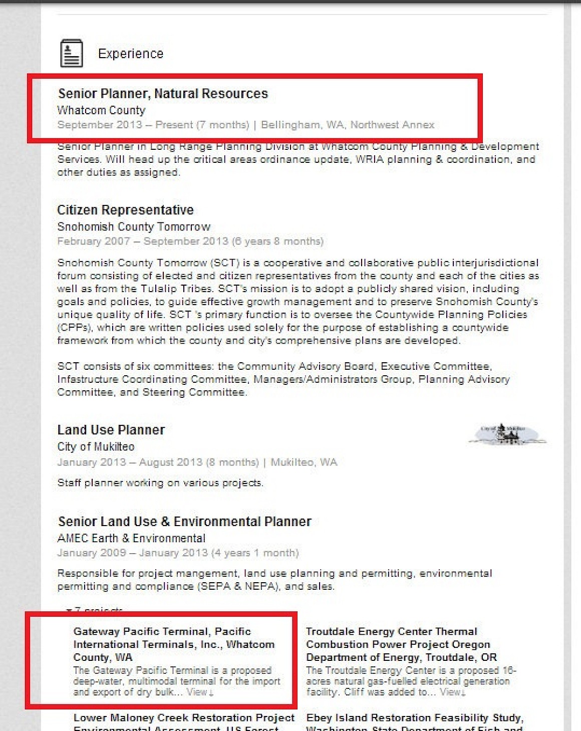 However, he was already well-known within the planning department since he was the one handling (or not handling) permits for Gateway Pacific Terminal when they got caught illegally clearing land up at Cherry Point. At the time, Strong was working for AMEC Earth and Environmental, which was employed by Gateway Pacific Terminal. When they had to apply for retroactive permits for what they had done, Strong was the first name listed as the applicant (see page 6 here). On page 11 of this correspondence about the illegal clearing, the representative for the terminal refers to Strong as, "our planner on the Gateway Pacific Terminal project."
