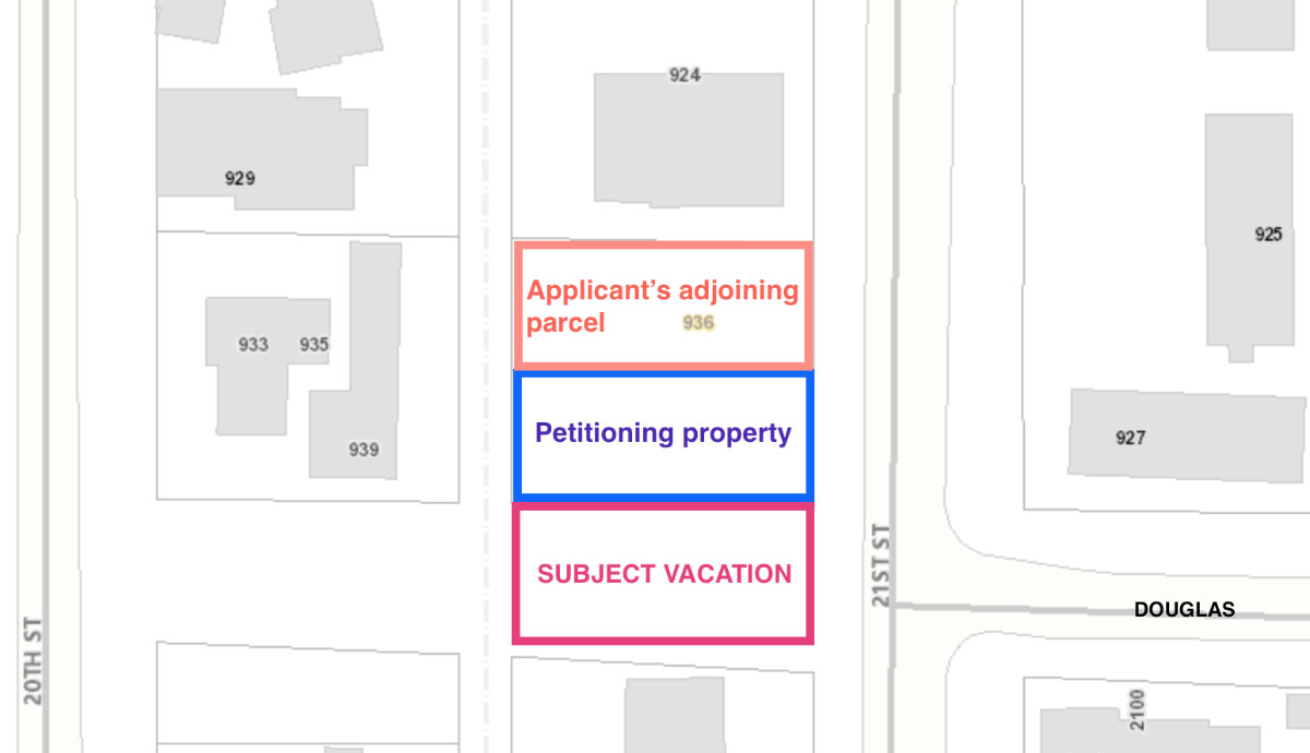 The first peculiarity is that it asks for the entire ROW. Adjoining properties normally only get the adjoining half. In this case, Applicant Dick Skeers reportedly “inquired” and “determined” that the opposite adjoining property was not interested in their half, so asked for all of it.