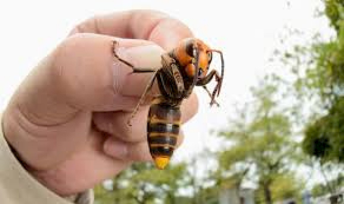 These ground-dwelling hornets measure a whopping 1.5 - 2 inches in length, have a yellow-orange head, and striped body. They have a stinger that is longer than a typical hornet, but are not particularly aggressive toward humans, unless you swat at them or interfere with their underground nests. On the other hand, a single sting can deliver a larger dose of venom and the venom is more toxic than local bees and wasps. According to the Department of Agriculture website, a person who is allergic to bee or wasp stings should never approach an Asian giant hornet.