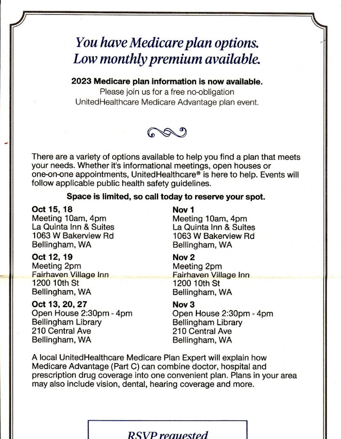 I received a card in the mail a few days ago from United Healthcare. I was shocked to see that they are having open house forums in our Bellingham Public Library.