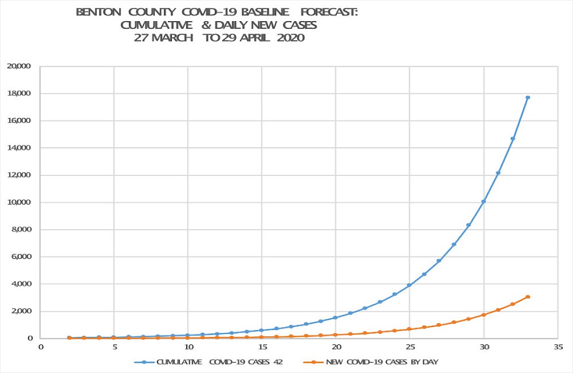 With these data, I constructed a simple, extrapolative geometric model that is used to forecast confirmed cumulative and new COVID-19 cases by day to April 29th. The forecast shows an expected peak with 17,716 total confirmed cases expected by April 29th including 3,049 new cases that would be confirmed on April 29th. Benton County’s population is approximately 202,000 If the baseline forecast comes to pass, nearly nine percent of Benton County’s population will be confirmed as infected by April 29th. The forecast goes out to April 29th because that is approximately when this initial surge will likely peak in Benton County.