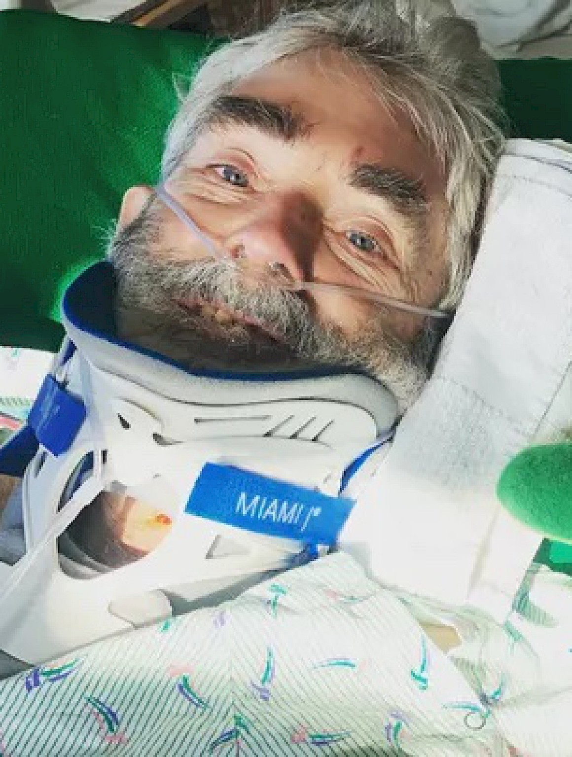 On the evening of 11/21/22, I got a call from my brother who told me that the paramedics were on the way because he had come home to find Stoney in the dark at the bottom of the stairs, his face smashed up against the wall, unable to move, confused, with blood pooling at his head. The paramedics took Stoney to the emergency room at St. Joe's in Bellingham and he was then flown to Harborview in Seattle. We learned that he had fallen down the stairs, broken his neck, and been paralyzed with an incomplete spinal cord injury. At Harborview, he had surgery to fuse cervical vertebrae 2 through 6. The injury and surgery left him nearly completely immobilized, without the ability to swallow, breathe well, and move anything aside from his left leg. He lost forty pounds during his stay at Harborview.