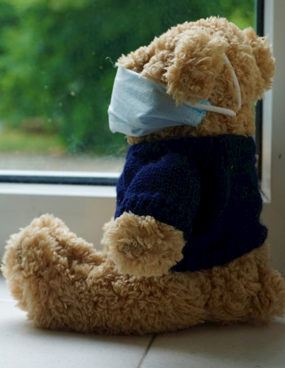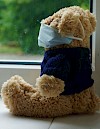 Masked teddy bears in windows for cheer and solidarity in time of COVID. .