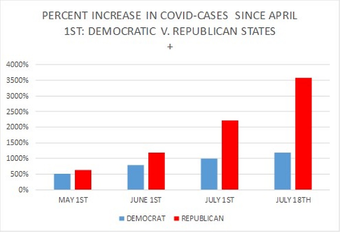 So, we aggregated the 178 million residents of the 21 “Democratic-leaning states” (the 20 states that Clinton carried in the 2016 presidential election and the District of Columbia) and the 150 million residents of “Republican-leaning states” (the 30 states that Trump carried in the 2016 presidential election) into two separate groups. We then summed the total COVID-19 case counts for each group on five dates, April 1st, May 1st, June 1st, July 1st and July 18th. The graph at the top of this article reveals that in comparing these two aggregated populations from April 1, 2020 to each of the subsequent dates, the Republican-leaning states are not only experiencing a higher rate of increase than the Democratic-leaning states, but the rate is accelerating.