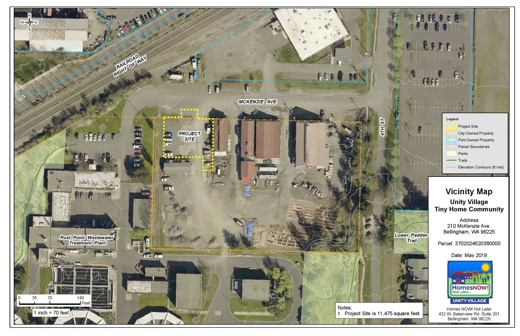 The Fairhaven Unity Village location is proposed for 210 McKenzie Ave. and will have 20 tiny homes, completed in phases. HomesNOW will start with 12 tiny homes and eight tents, as more tiny homes are built, tents will be removed. HomesNOW intends to build and manage the Unity Village tiny home community in accordance with Ordinance No. 2018-10-019, Bellingham Municipal Code, permit requirements, Washington state laws and regulations, and Whatcom County Health Department regulations. The project will take approximately eight months to complete, ending in April 2020.