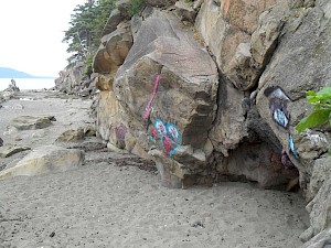 Yes, the park ranger at Larrabee State Park has been notified and sent some of these photos. Tim Paxton, a contributor to this site, enjoys strolls on the beach and found these yesterday. He says they were sprayed on between July 1 and July 11. Last time - a year or two ago - a huge volunteer group, with guidance from park rangers, managed to erase the graffiti. In truth, graffiti can be legitimate and okay - but not when used to deface other art and beauty.