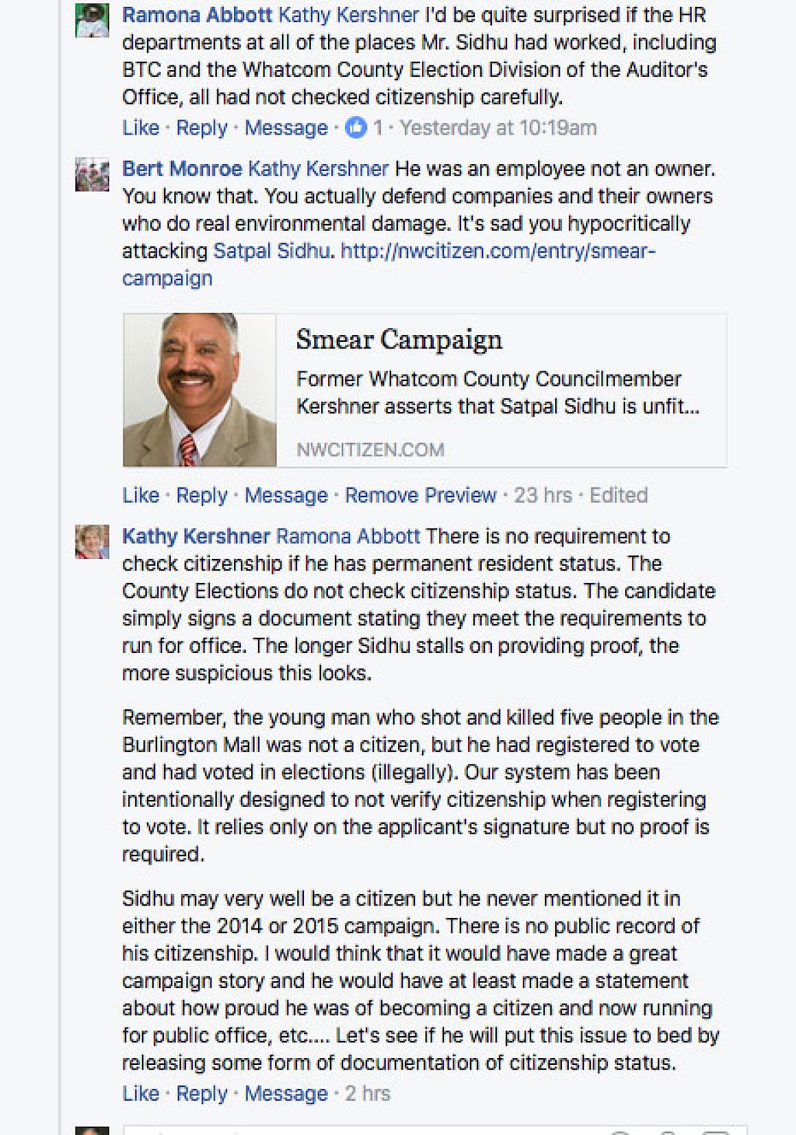 Recently, Ms. Kershner posted a comment on Mr. Sidhu’s election Facebook site challenging his citizenship status. “There is no requirement to check citizenship if he has permanent resident status,” she wrote. “The County Elections do not check citizenship status. The candidate simply signs a document stating that they meet the requirements to run for office. The longer Sidhu stalls on providing proof, the more suspicious this looks.”