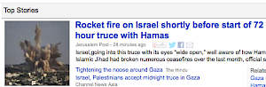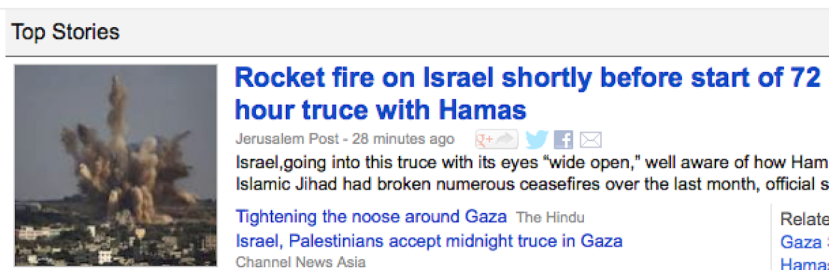 Today’s Google News top story - and illustration. Big explosion there. But despite the headline about “rocket fire on Israel”, this is a photo of Israel bombing of Gaza. The opposite of the headline. This is all too common in our press - and it leaves the opposite impression in our minds from the truth.