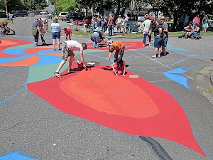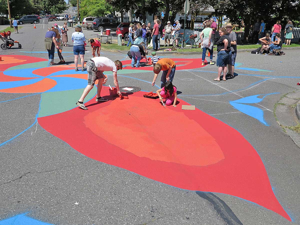 On Saturday, the residents of the Happy Valley neighborhood in South Bellingham turned out for their long planned day of painting the streets. Literally. The intersection of Harris Avenue and 22nd Street was chosen a year ago to become a sort of informal but colorful center of the neighborhood - a visual focal point for the future. Aaron Walters, one of the leaders of the neighborhood association, has led the way, getting the cooperation of the city public works department. The concept has roots in Portland, Oregon, where several street corners have been thus improved.