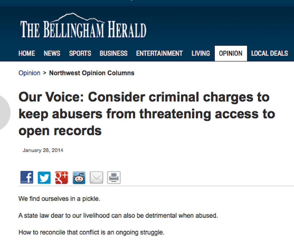 Did you know that we could “exceed our rights to information” by making too many public record requests, or making a request that was too broad, or making a request with the improper motive?  According to an editorial of unidentified origin, reprinted in the Northwest Opinion Column of The Bellingham Herald, “there are some people—including a few right here in our community—who have crossed the line with their information requests.”  (No need to name these people…. Obviously, you know who you are.) http://www.bellinghamherald.com/2014/01/28/3445095/our-voice-consider-criminal-charges.html; January 28, 2014.