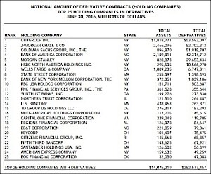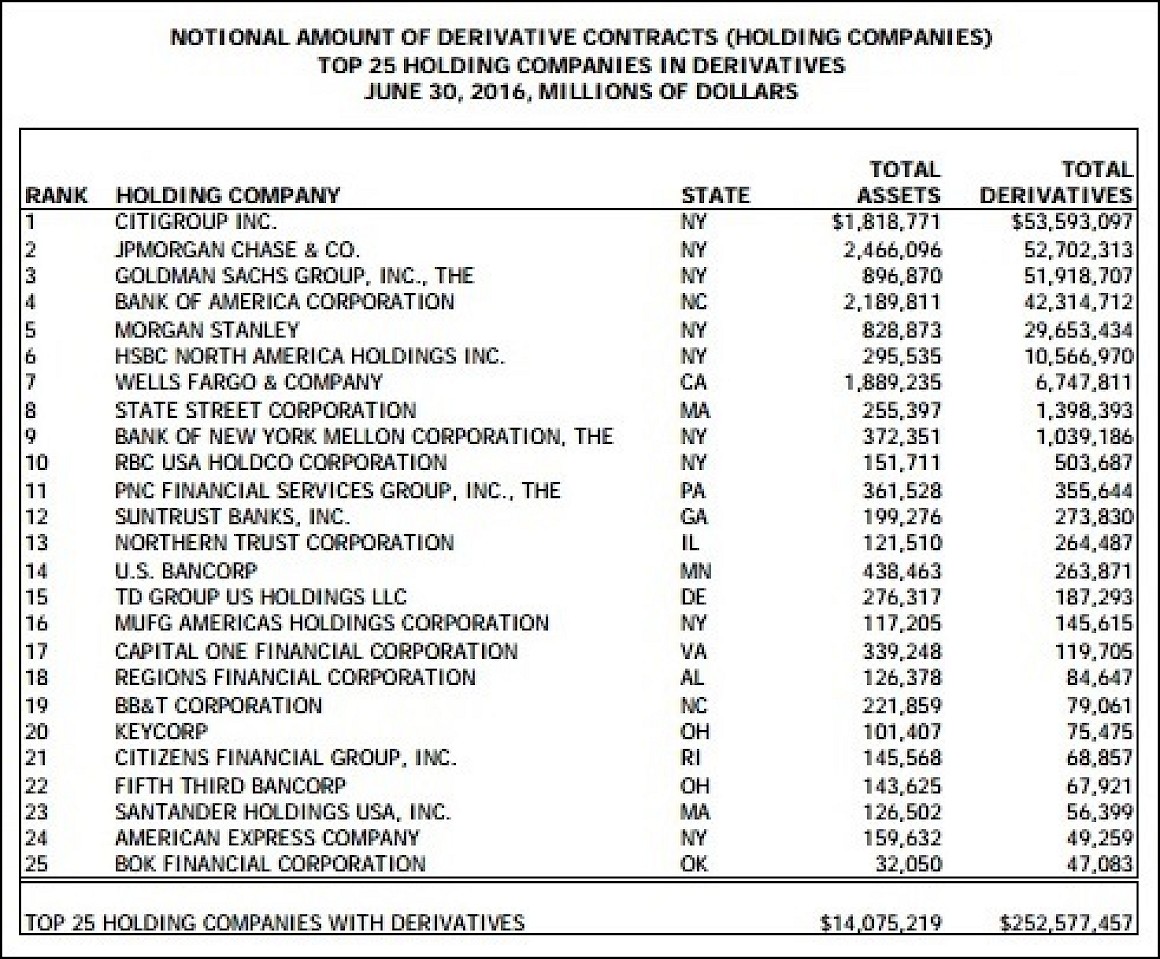 Today, the Martens updated an article on derivatives they published last January in a piece entitled “Shhh! Don’t Tell this Bank Regulator We’ve Got a Derivatives Problem. The problem is that the total amount of notional derivatives on the books of these banks, more notably the U.S. banks ( Citigroup, JPMorgan Chase, Goldman Sachs Group, Bank of America and Morgan Stanley) now have $252 trillion in notional derivatives (AKA Shit) on the books. Clearly the OCC is failing in its regulatory duties and the FDIC cannot possibly respond to the deposit insurance demands of depositors.