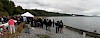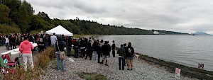 Folks gathered on the beach at Cherry Point at the Lummi Nation's invitation. In the background a ship unloads bauxite at Intalco. .