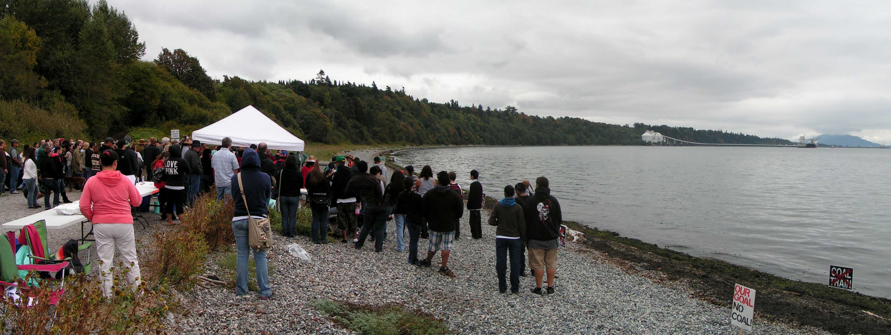 Finally, the event was in no way a protest. Yes, they said "NO" to the coal port, but the event was actually a promotion. The words and feelings, the songs and ceremony protested nothing. They spoke of preserving, protecting and promoting their way of life and how that meant potecting the water, trees and animals who share it and upon which it depends. They spoke to Cherry Point as an example of how quickly resources can become depleted and how herring support the salmon and the salmon support the whales, and how the whales, and Cherry Point, figure prominently in the lore of Lummi creation. Taking a firm stand against an immanent threat to your way of life is not a protest. It is justifiable defense.
