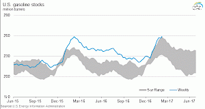 As the graphic shows, US gasoline inventories are at a 27-year record high. And yet, gas prices and oil prices continue to rise - having increased by about 30-40% (depending on the grade and source) in 2016. And as the second graphic shows, US gasoline consumption in the first part of 2017 is down 8% from the same period in 2016. Strange things are happening -