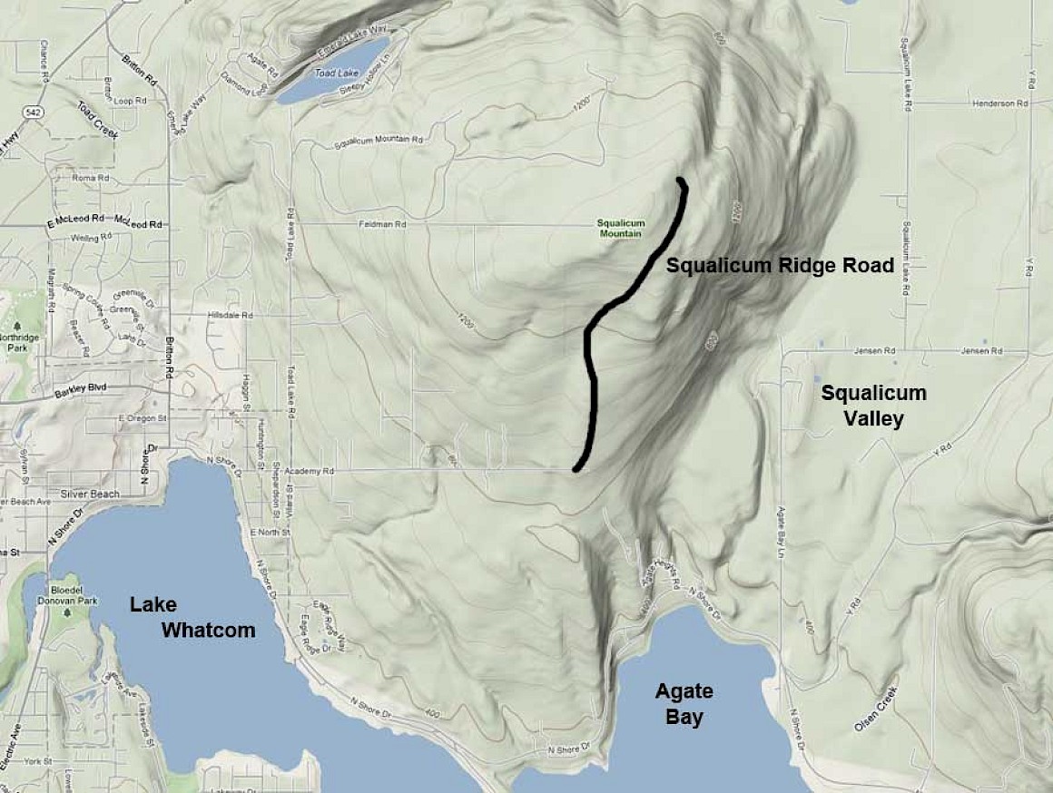 Approximate two mile long road located above the drainage into Squalicum Valley and Lake Whatcom. At the south end, the new road starts near the end of existing Academy Road. .