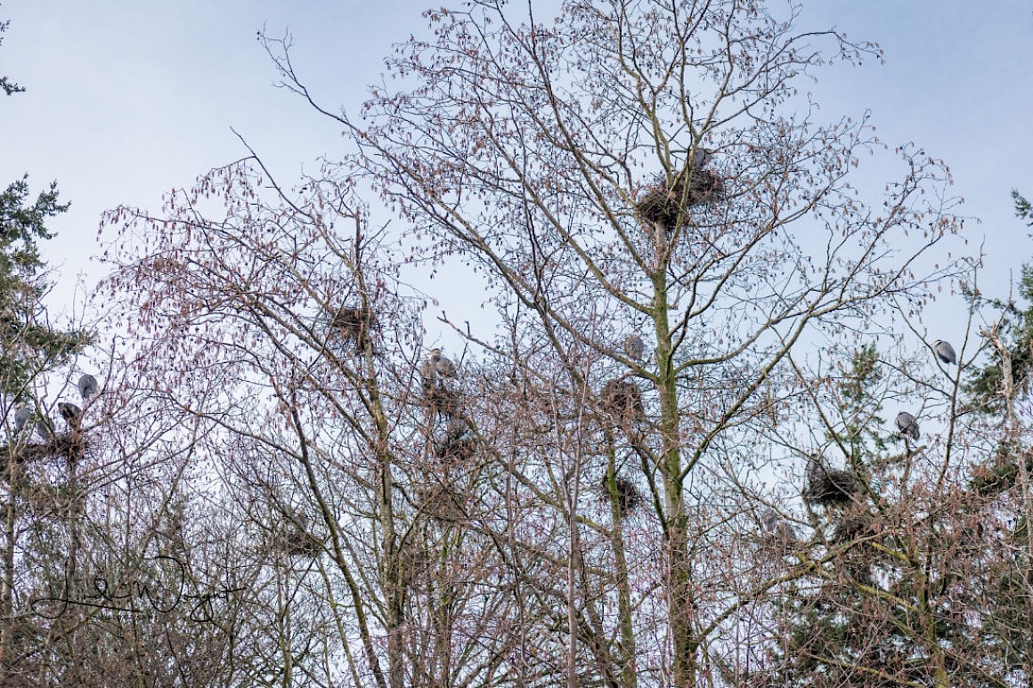 Herons in their nesting trees late this February. Photo courtesy of Linda Wright Photography. .