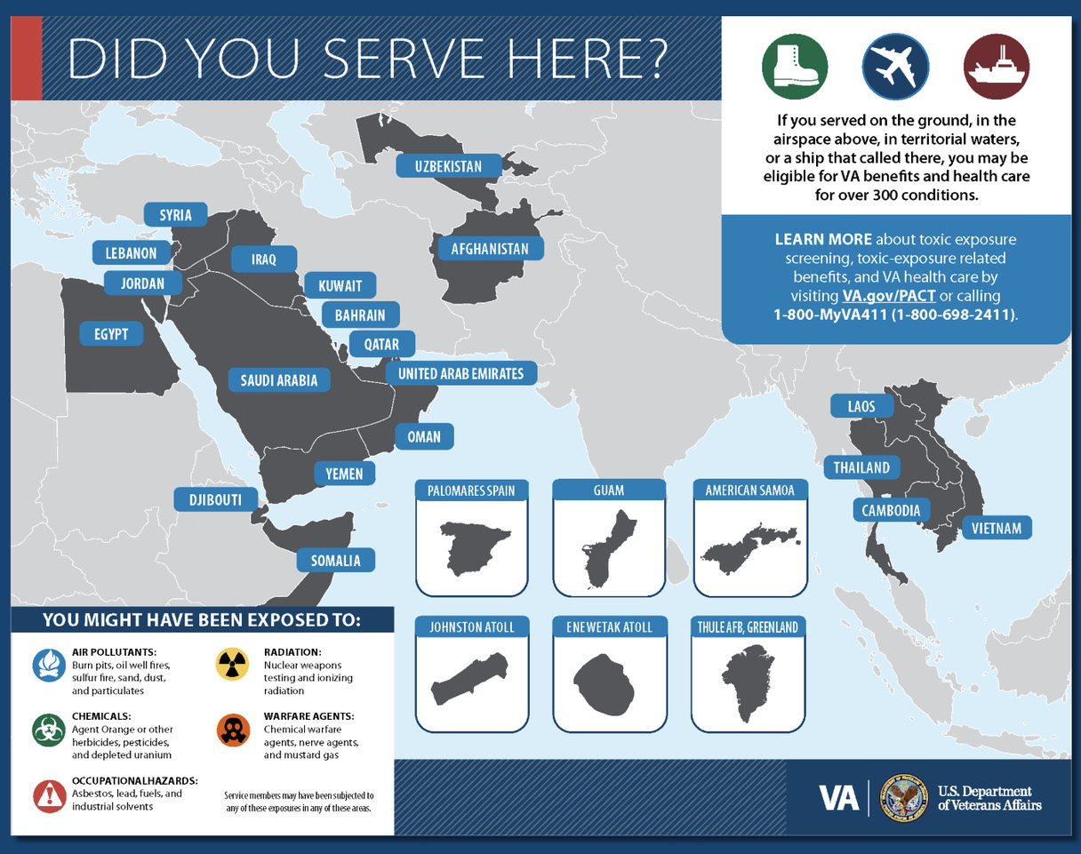Even if you DID NOT SERVE in the areas indicated on the graphic above, you may be eligible. Please see the Pact Act Overview below. The only way to find out is to apply…NOW!