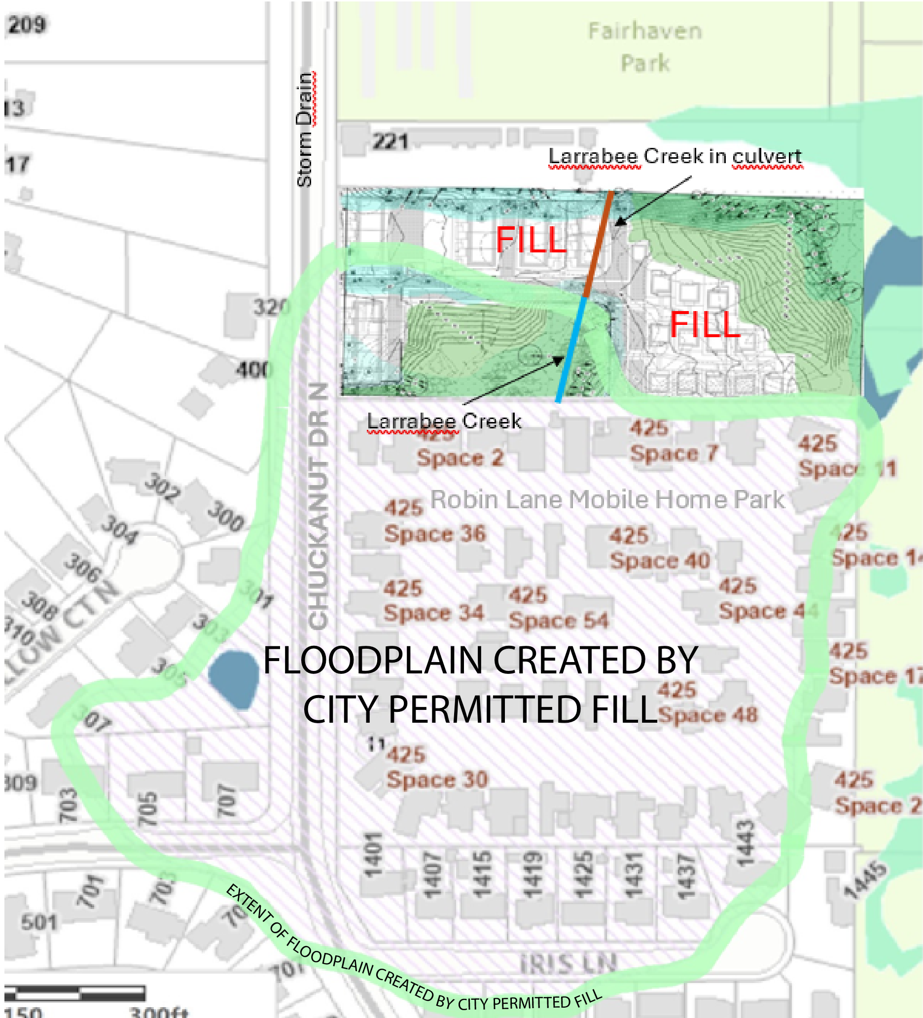 Before the era of historical developers C.X. Larabee and J.J. Donovan, the watershed drained through the lowest elevation, like it still does through the culvert. If the development plan is approved as-is, and the Chuckanut storm drain is overwhelmed or fails, water will find the lowest elevation over the fill. That would make everything that is upstream, and lower than the fill, into a lake that would flood the 62 homes of Robin Lane Mobile Home Park and the northern half of Iris Lane.
